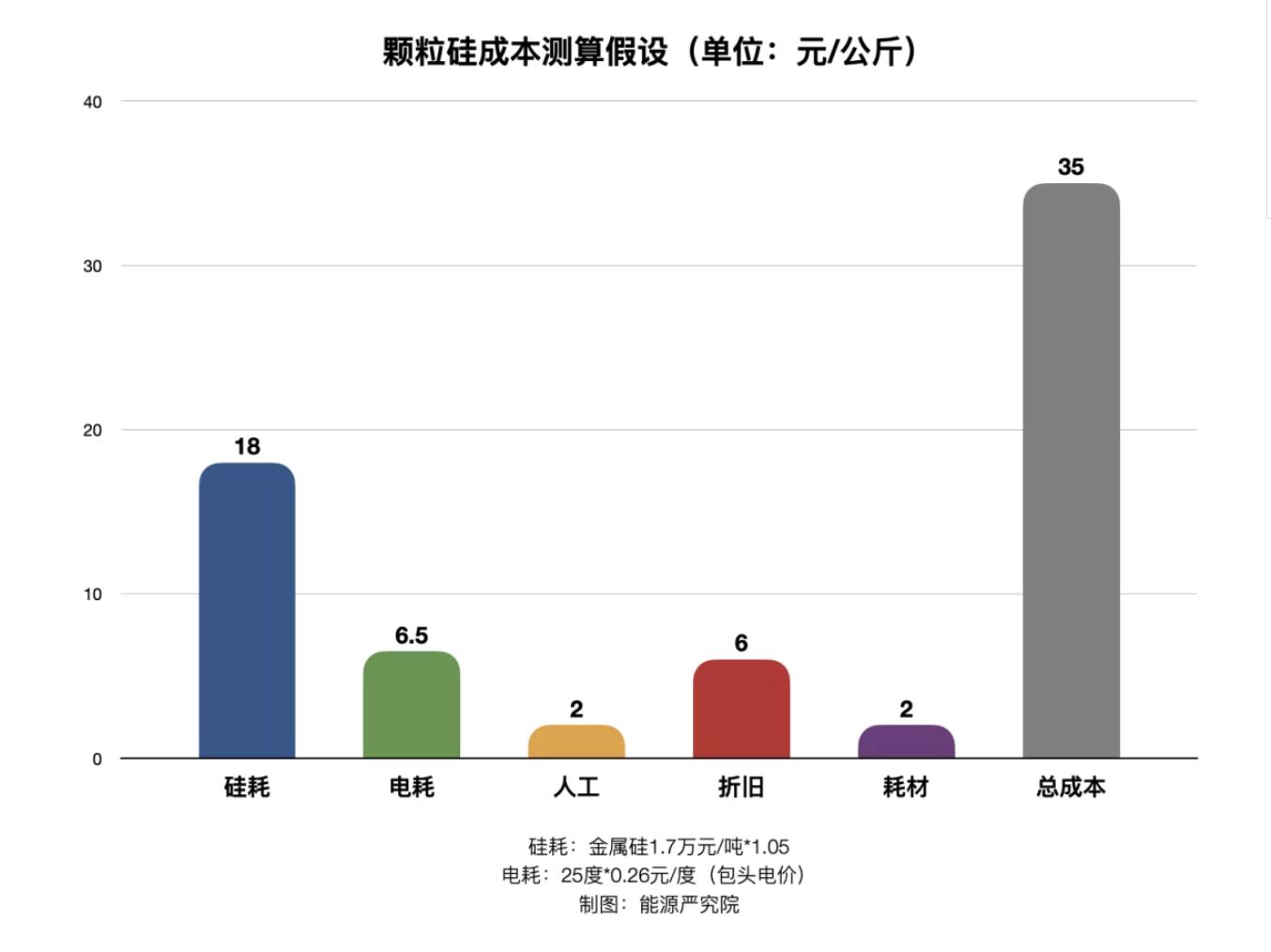 一項(xiàng)關(guān)于顆粒硅成本預(yù)想測(cè)算表明,在統(tǒng)計(jì)硅耗、電耗、人工、折舊、耗材等成本要素后,顆粒硅的全成本約為每公斤不足35元,甚至更低。