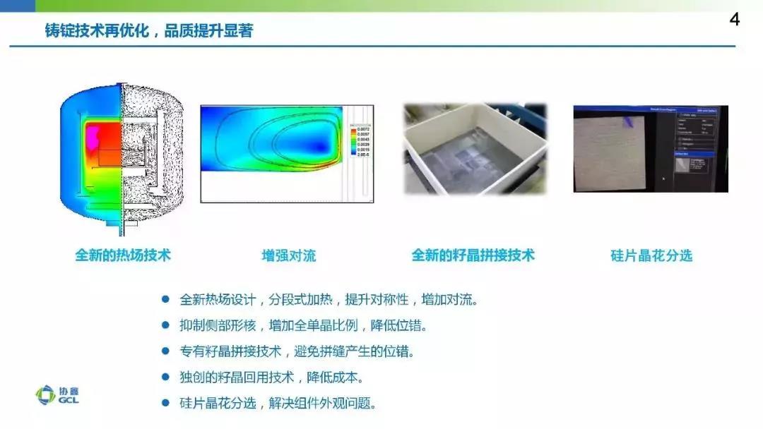 下面我們來(lái)看一看協(xié)鑫鑄錠單晶的研發(fā)歷程。大家或許通過(guò)我的報(bào)告,可以體會(huì)到現(xiàn)在為什么是鑄錠單晶“新”的應(yīng)用時(shí)代。2011年,整個(gè)光伏行業(yè)都在做或準(zhǔn)備做鑄錠單晶,那可謂是鼎盛時(shí)期。協(xié)鑫、賽維、晶澳、昱輝等企業(yè)都推出第一代鑄錠單晶產(chǎn)品,組件產(chǎn)品也有應(yīng)用,但是由于種種原因沒(méi)有大范圍推廣。盡管如此,協(xié)鑫依然沒(méi)有停止研發(fā)的腳步。2013年,協(xié)鑫開(kāi)發(fā)出鑄錠單晶第二代,2017年又推出第三代鑄錠單晶,即“鑫單晶G3”。這一代產(chǎn)品很不錯(cuò),經(jīng)過(guò)一年多的降本提效,市場(chǎng)逐步接受。到2018年底,幾家主要客戶(hù)開(kāi)始規(guī)?;瘧?yīng)用。所以我認(rèn)為,鑄錠單晶“新”的應(yīng)用時(shí)代真正到來(lái)了,而且市場(chǎng)份額會(huì)提升得非常迅速。